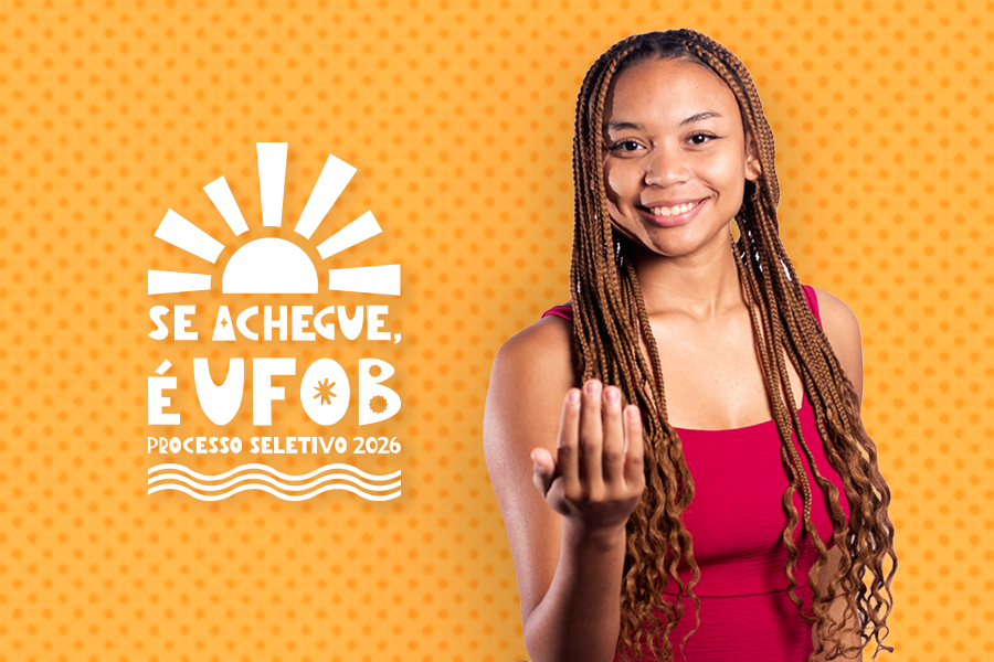 Arte em fundo laranja com marca da campanha "Se achegue, é UFOB" e estudante com o braço estendido chamando