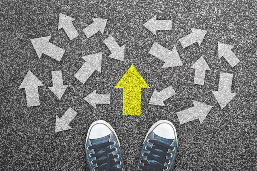 Imagem mostra um corte aparecendo apenas dois pés de uma pessoa usando um tênis azul. Em frente a essa pessoa, há no chão várias setas desenhadas indicando sentidos diversos, dando a ideia de possibilidades de caminho a seguir.
