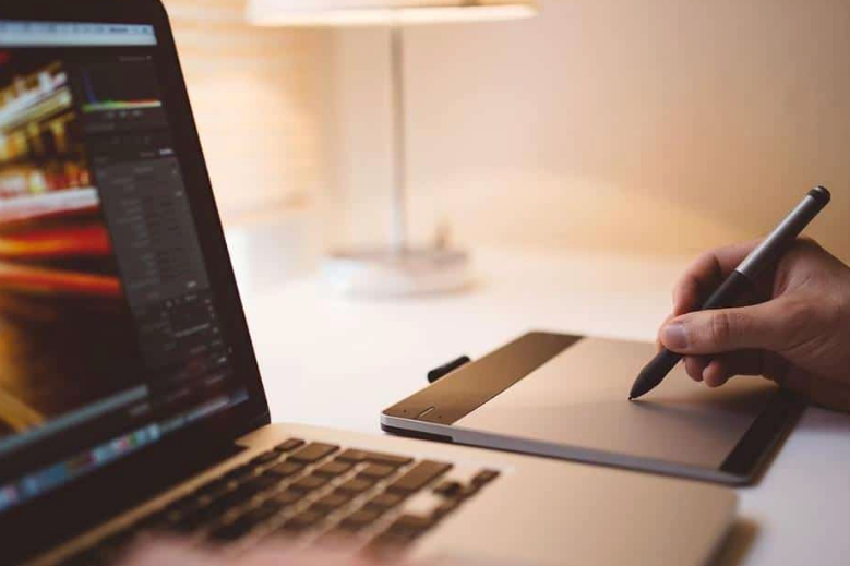 Imagem de tela do computador com mão escrevendo em um tablado