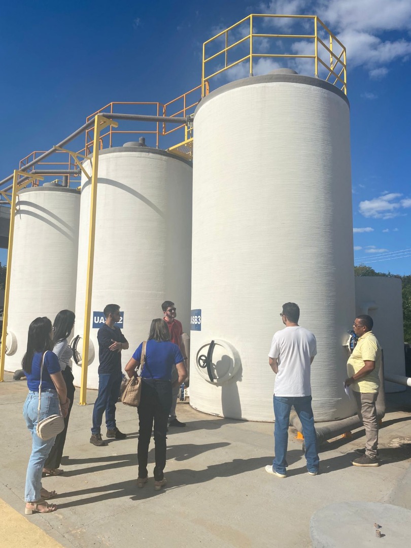 Imagem em fundo cinza de três pessoas estudantes da UFOB, dois com braços cruzados e outra com uma bola de basquete na mão