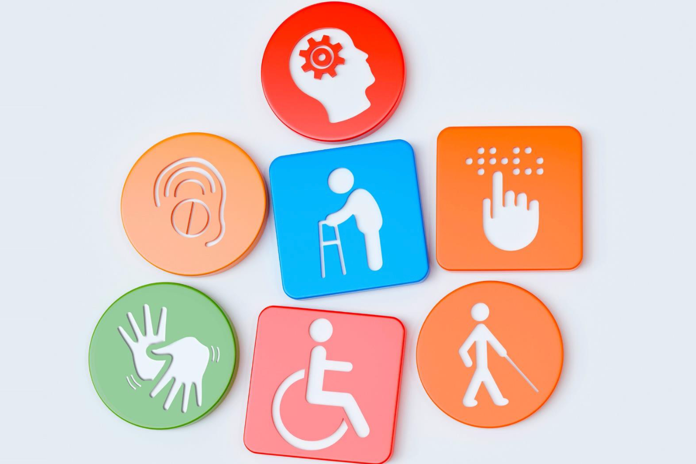 Arte em fundo branco com ícone de pessoa cadeirante, com dificuldade de locomoção, com transtorno do espectro autista, dentre outras