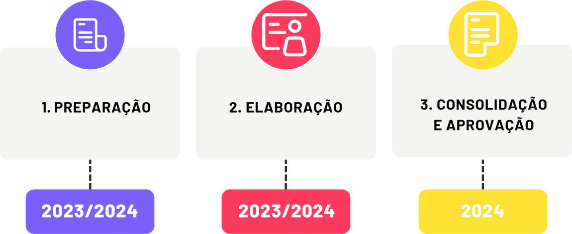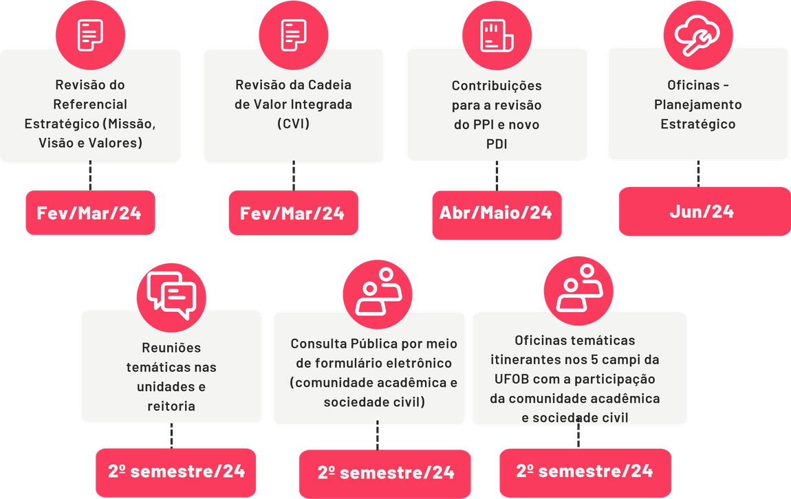 A fase de elaboração trata-se da segunda fase destinada para a construção, de forma participativa, do Plano de Desenvolvimento Institucional (PDI) da UFOB: (i) Revisão do Referencial Estratégico (Cadeia de Valor Integrada - CVI, Missão, Visão e Valores da UFOB); (ii) Revisão da Cadeia de Valor Integrada (CVI); (iii) Recebimento de contribuições para revisão do Plano Político-Pedagógico Institucional (PPI) e novo PDI; (iv) Oficinas de Planejamento Estratégico; (v) Reuniões temáticas nas unidades acadêmicas e reitoria; (vi) Consulta Pública por meio de formulário eletrônico; (vii) Oficinas temáticas itinerantes nos 5 campi da UFOB. Esta fase envolve da participação dos gestores das unidades acadêmicas/administrativas e da comunidade acadêmica (estudantes, técnicos administrativos, docentes e colaboradores terceirizados) e sociedade civil, tendo iniciado em fevereiro de 2024 e com previsão de conclusão no 2º semestre de 2024.