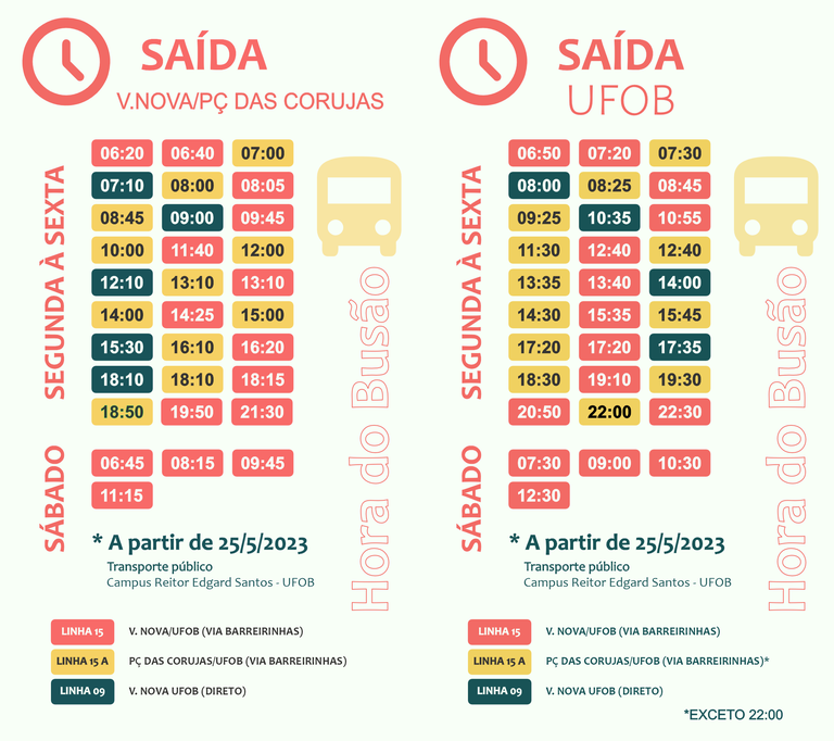 Alteração no horário do ônibus LINHA 15 e LINHA 15A a partir de 25/5/2023 – Retificação do horário de 22h do linha 15 A