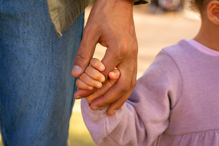 Imagem em close na mão de um adulto segurando a mão de uma criança