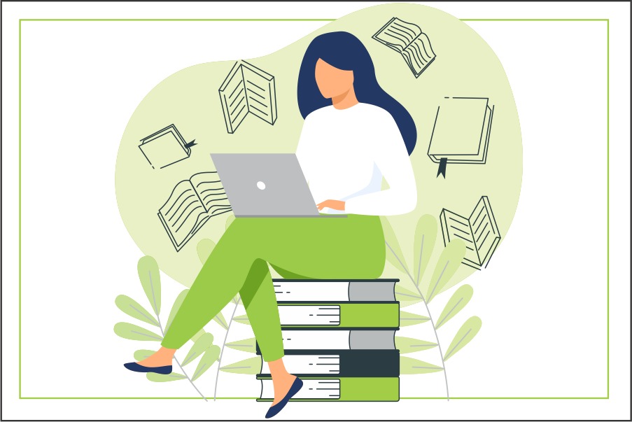 Imagem em fundo branco com sombra verde de mulher sentada sobre uma pulha de livros e com notebook na mão