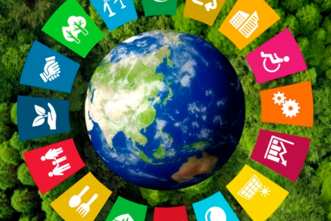 Imagem de mapa mundi sobreposta a floresta com arte dos Objetivos de Desenvolvimento Sustentável (ODS)