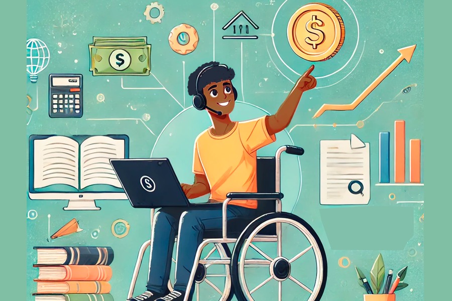 Imagem em fundo verde com desenho de pessoa cadeirante ao centro e ícones de tecnologia assistiva ao redor