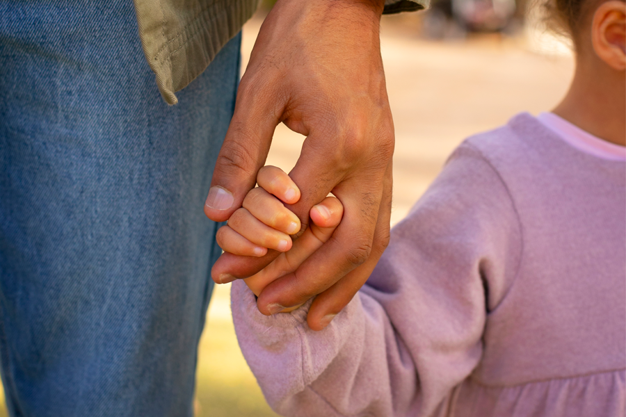 Foto em close na mão de um adulto segurando a mão de uma criança