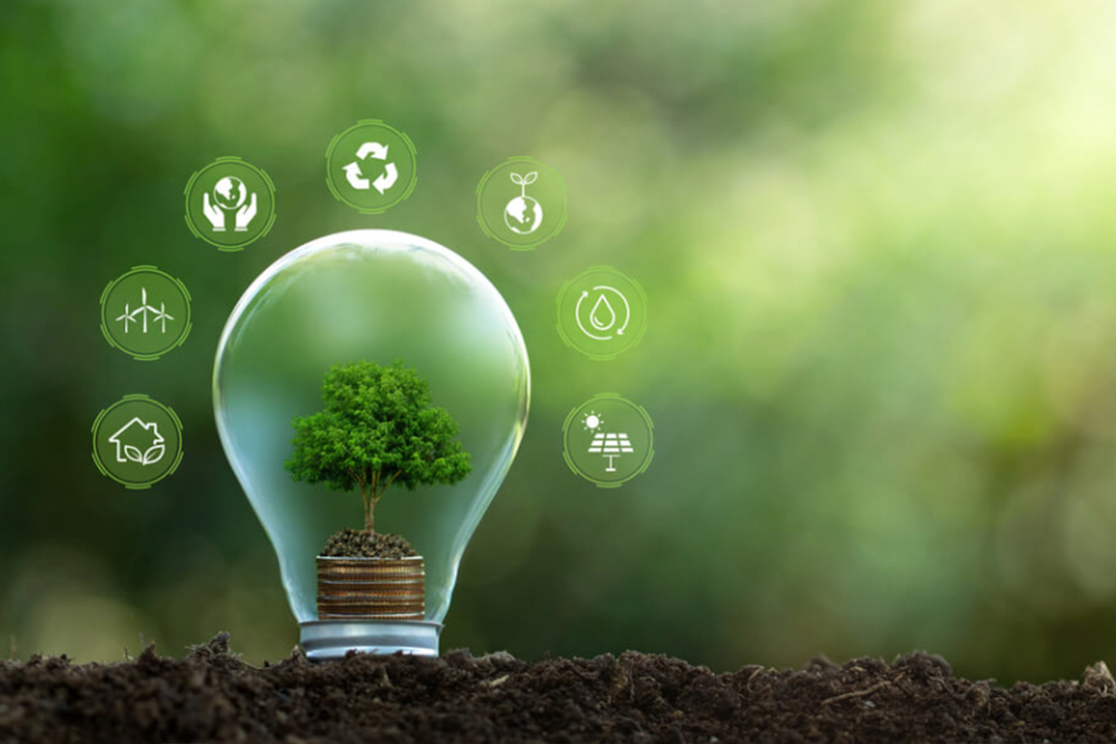 Arte em fundo verde com uma lâmpada rodeada de ícones que remetem à sustentabilidade