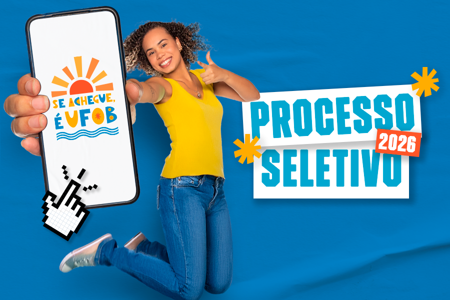 Arte em fundo azul com estudante pulando e segurando um celular com o texto "Se Achegue, é UFOB" | Processo Seletivo