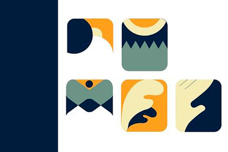 Arte em fundo branco e azul escuro com símbolos do sol, da água e ciências humanas e sociais