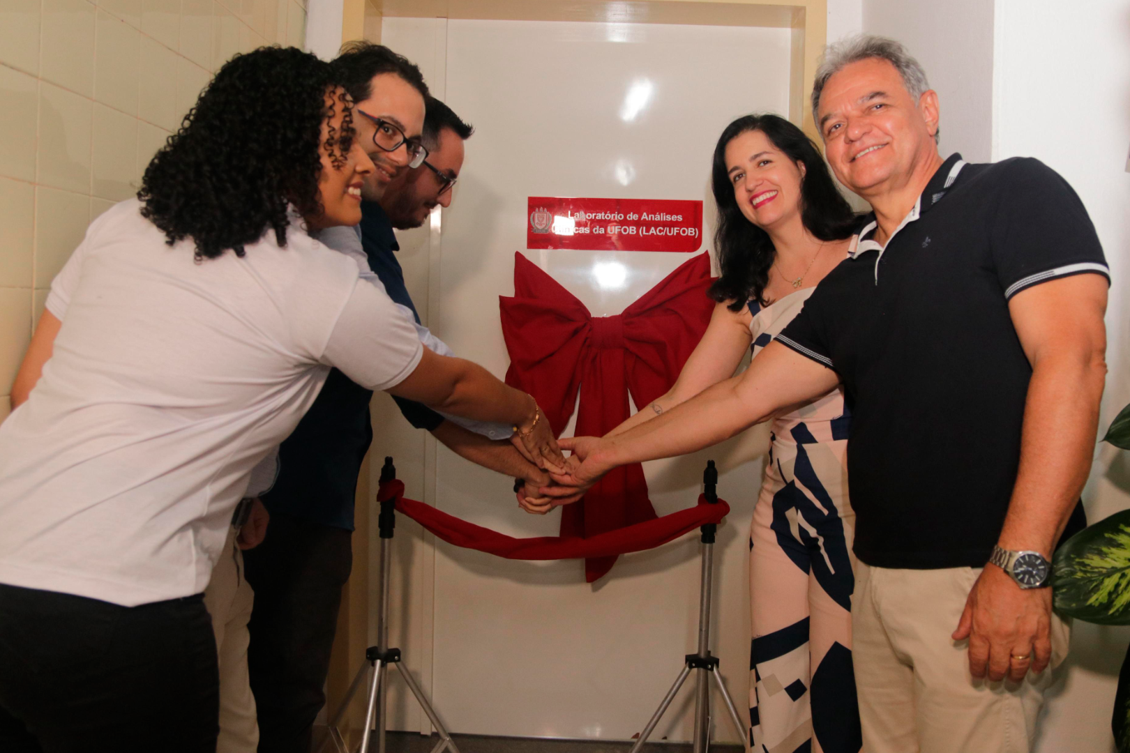 Foto de descerramento do laço de inauguração do Laboratório de Análises Clínicas Escola da UFOB