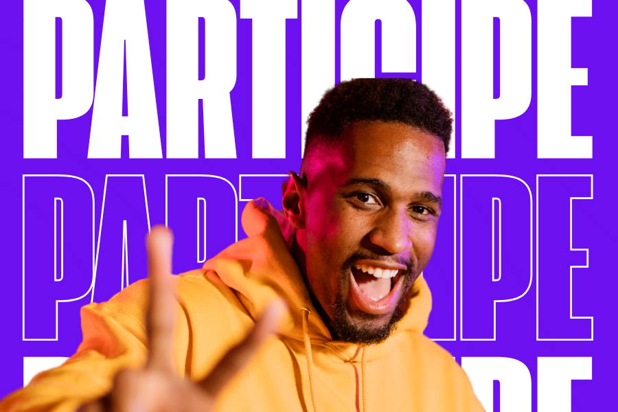 Arte em fundo lilás com foto de estudante e texto "Participe"