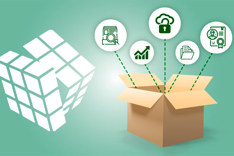 Arte em fundo verde com imagem de caixa com ícones de dados, certificação e pastas