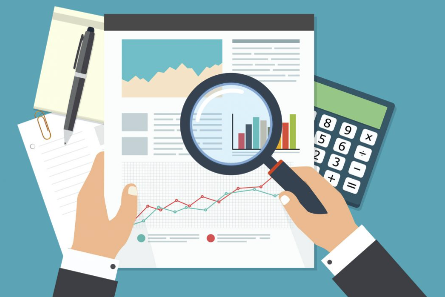 Ilustração em fundo azul de papel, com duas mão usando uma lupa para acessar dados e calculadora ao lado