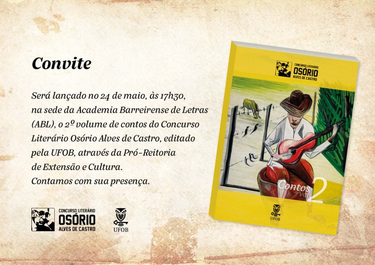 Será lançado no dia 24 de maio, às 17h30, na sede da Academia Barreirense de Letras, durante a FLIB, no centro de Barreiras, o 2º volume do livro de contos do Concurso Literário Osório Alves de Castro realizado pela UFOB, através da Pró-Reitoria de Extensão e Cultura. O livro apresenta 15 textos produzidos por autores residentes no Território de Identidade Acadêmica da universidade.