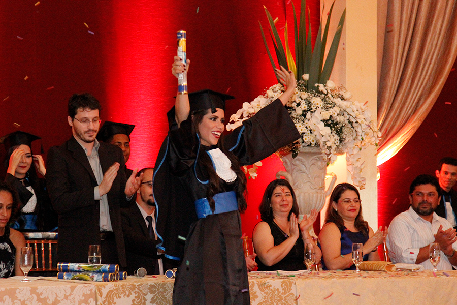 Foto de estudante com mãos ao alto celebrando formatura durante cerimônia de colação de grau da UFOB