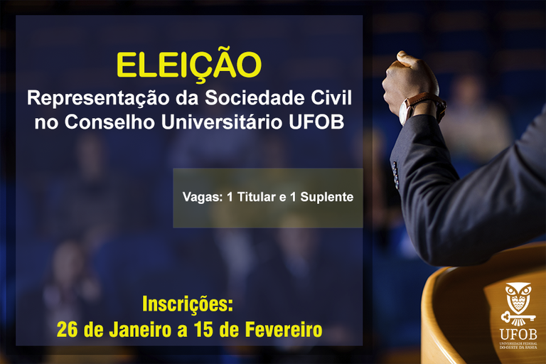 A Universidade Federal do Oeste da Bahia está com inscrições abertas para candidaturas referentes à eleição de representantes da sociedade civil, no Conselho Universitário (UFOB). São disponibilizadas 2 (duas) vagas, 1 (uma) para titular e 1 (uma) para suplente.