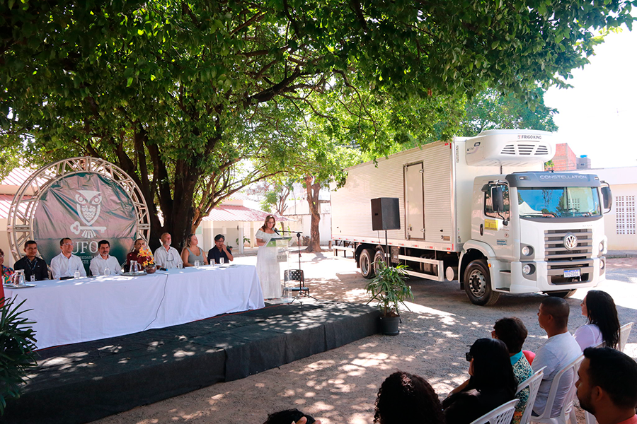 Foto da cerimônia de doação do Caminhão Baú para a UFOB, com mesa diretora com autoridades formadas e veículo ao fundo